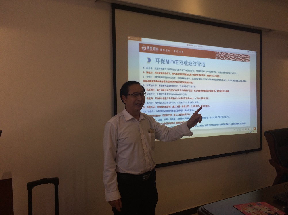 隨后,技術(shù)總監(jiān)張雙全從產(chǎn)品的原料配方、性能參數(shù)、規(guī)格型號(hào)、產(chǎn)品優(yōu)勢(shì)、配套產(chǎn)品、安裝使用、工程案例等多方面詳細(xì)介紹了MPVE?雙壁波紋管道系列產(chǎn)品并進(jìn)行了現(xiàn)場(chǎng)技術(shù)交流。在座的領(lǐng)導(dǎo)、專(zhuān)家、設(shè)計(jì)師們暢所欲言,提出了許多寶貴的意見(jiàn)和建議,對(duì)康泰產(chǎn)品給予肯定和贊譽(yù)。